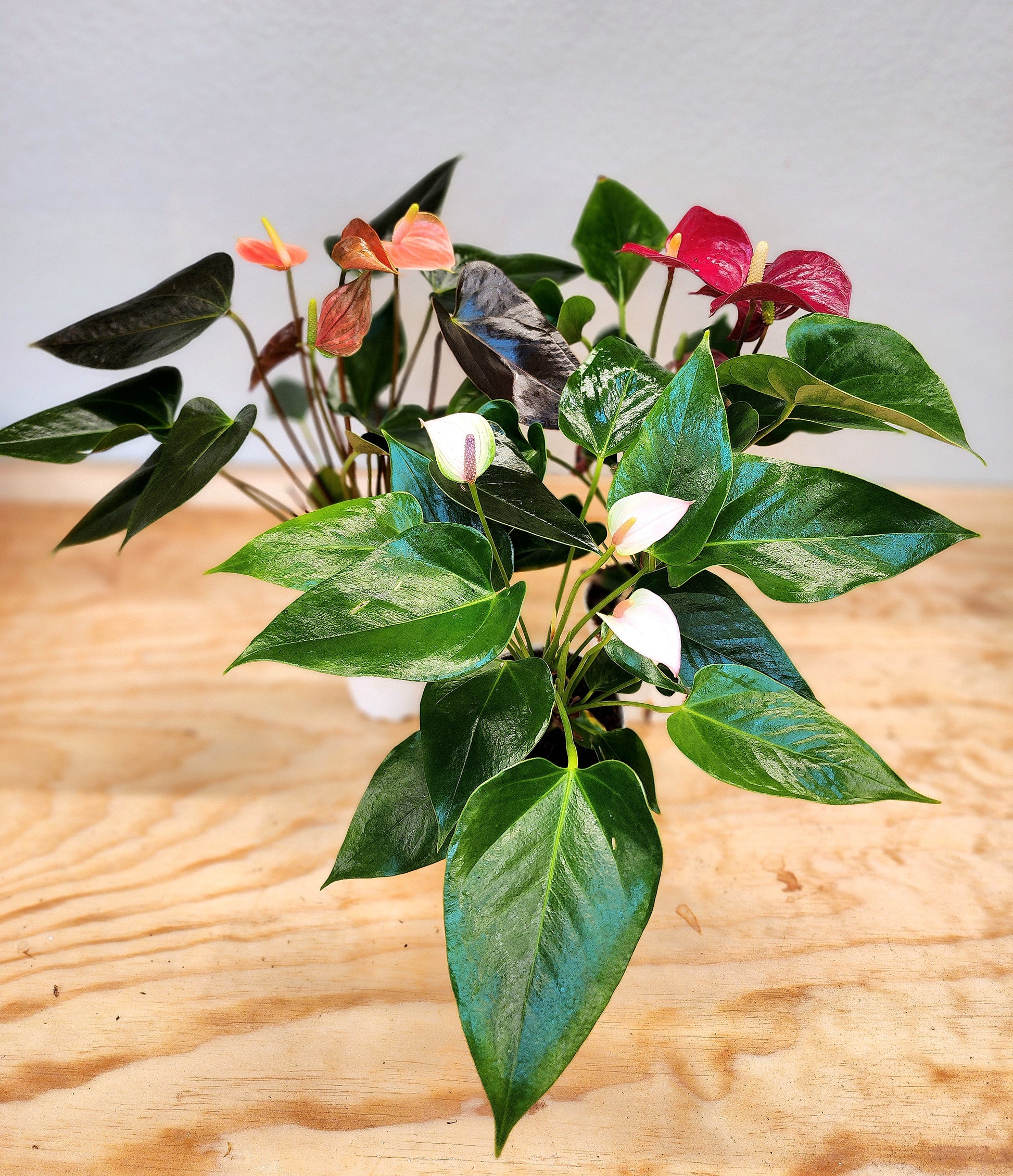 Introducing Anthurium Andraeanum (Flamingo Lily), a stunning houseplant native to Central and South America and the Caribbean. With its dark green, waxy, arrow-shaped leaves, it can grow up to 2 feet tall and wide. Its many colorful flower varieties can bloom repeatedly, bringing beauty to any home.