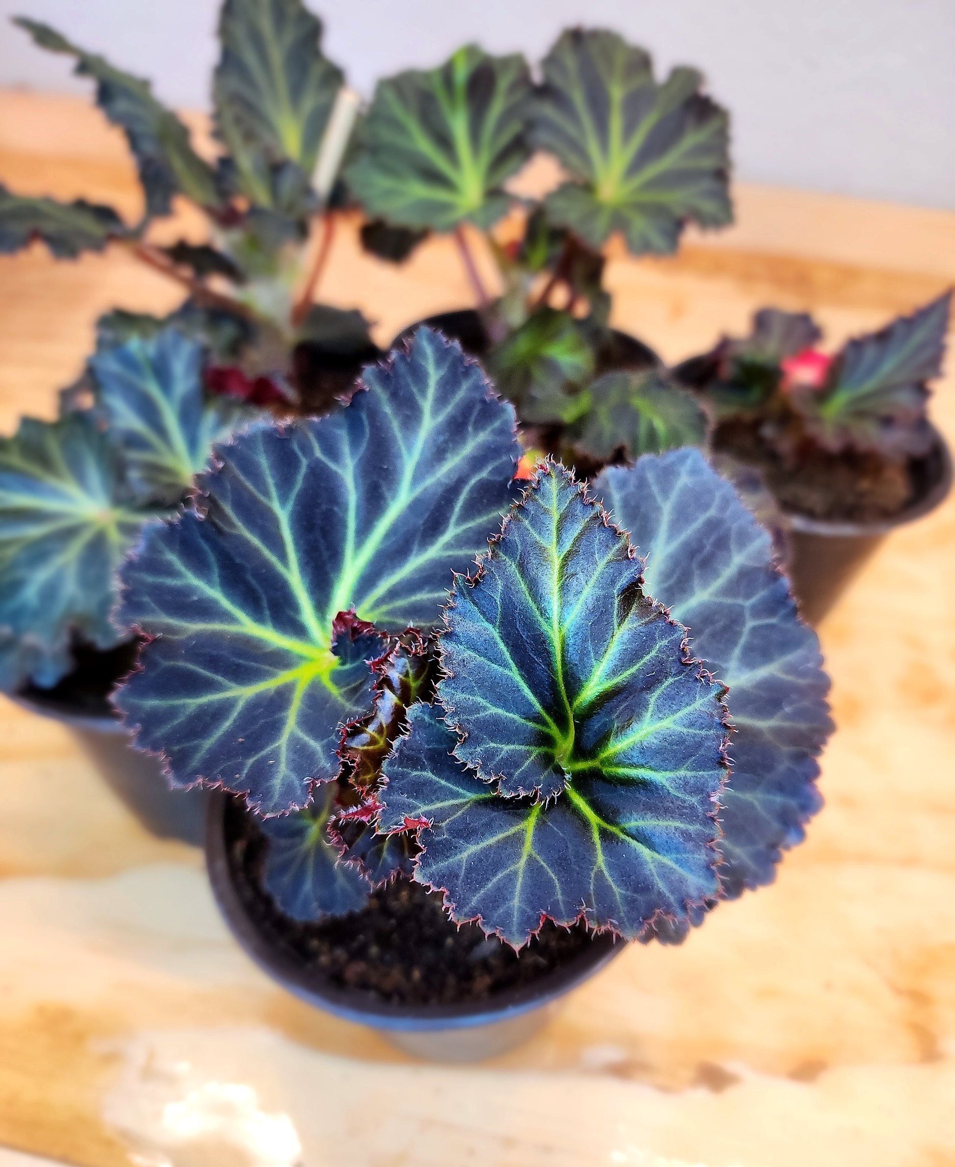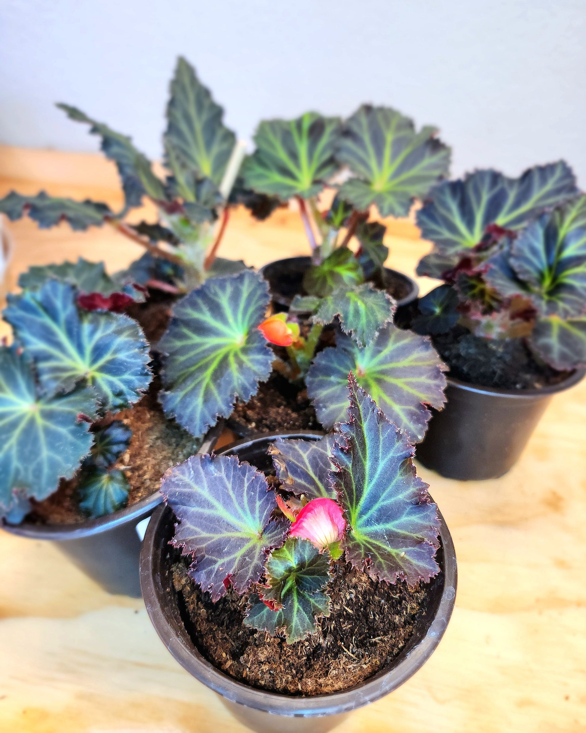 Begonia Tuberhybrida, known as Begonia Mocca Cherry, is a stunning tuberous begonia that boasts dark purple leaves with bright green veins. With its origins in South America and Southern Africa, it can grow up to 18 inches tall and 24 inches wide. Its beautiful red flowers, resembling roses, add a touch of elegance to any indoor or outdoor space.
