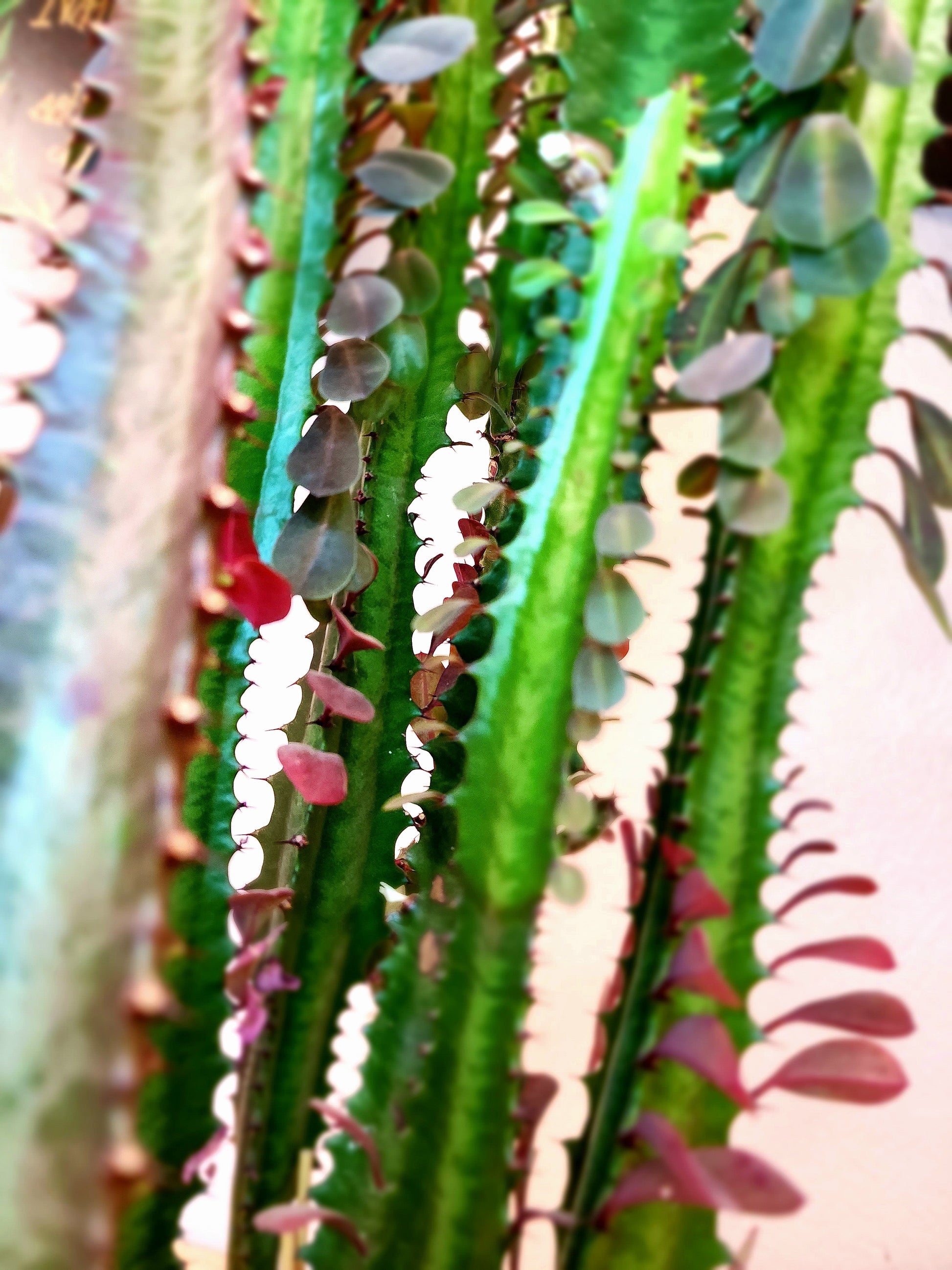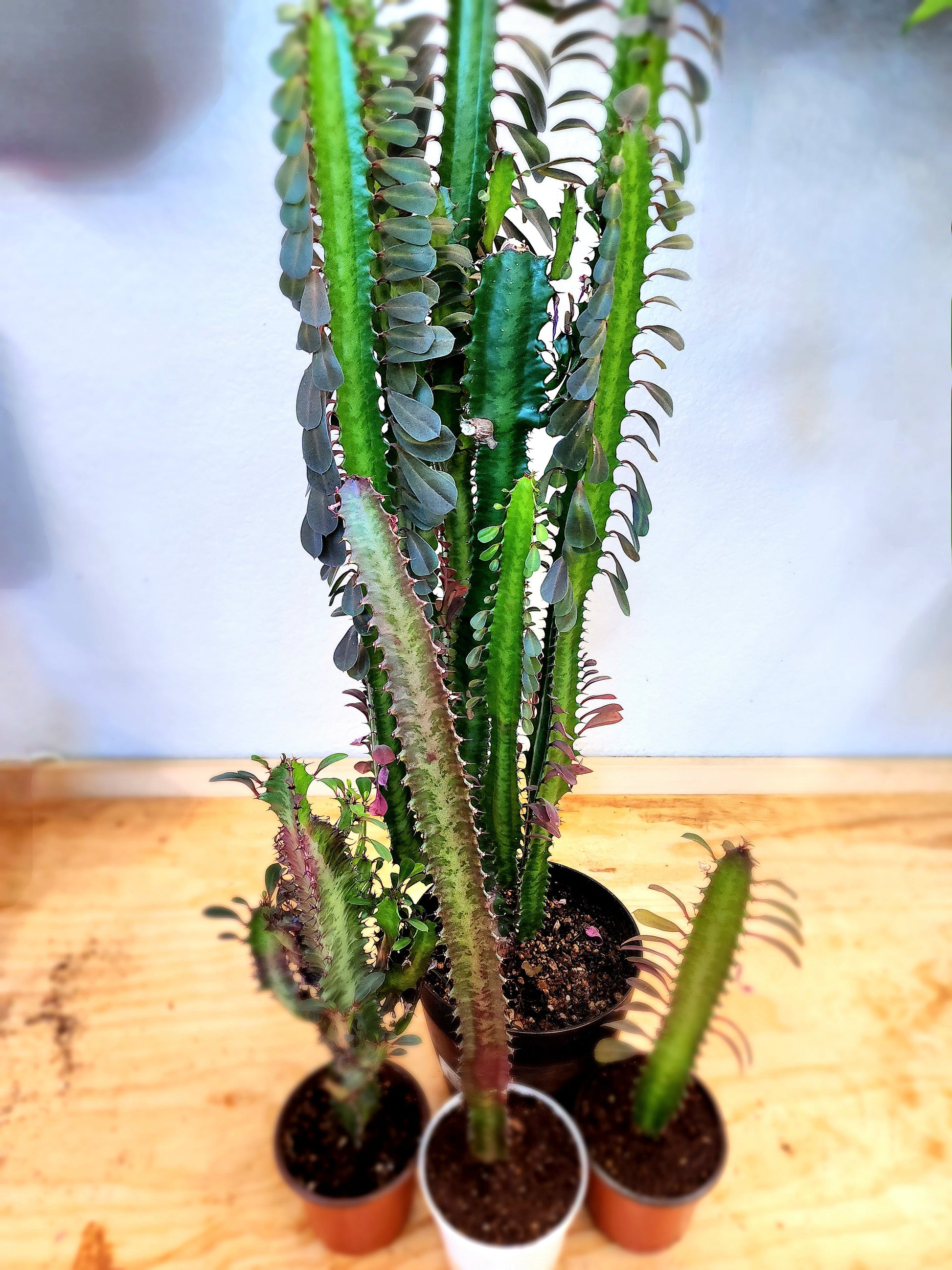 The Euphorbia Trigona, also known as African Milk Tree, is a unique succulent with cactus-like thorns and dark green leaves with burgundy/red tones. Growing up to 9 feet tall and 3 feet wide, this low maintenance plant is native to Africa and makes a striking addition to any indoor or outdoor space.