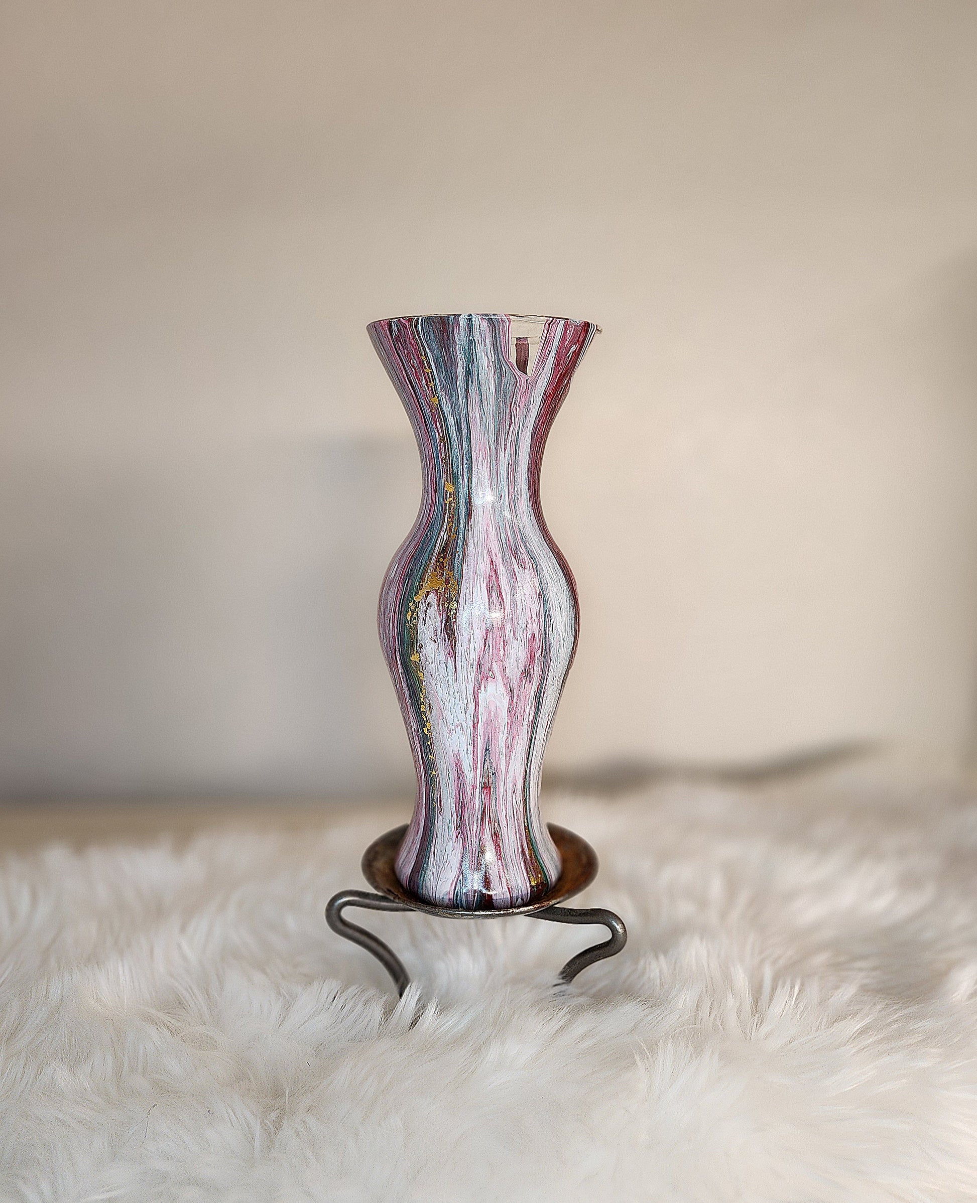 Add a touch of elegance to your home decor with our (White, Red, and Green with *Gold Flakes) Acrylic Fluid Art Vase. This one-of-a-kind vase is hand painted with intricate details, featuring a unique shape and shimmering gold flakes. Made of glass and measuring 3.5 inches in width and 9 inches in height, this vase is a perfect combination of beauty and functionality.